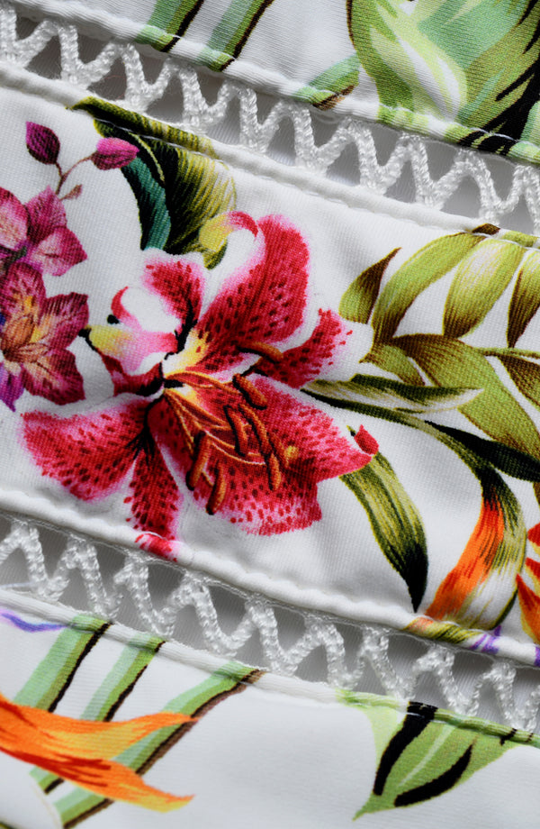 This lively floral design features a vibrant tropical print with lush green foliage and blooming pink, orange, and violet flowers set against a crisp white background. The coolest cover-up around, it can be worn two ways: open and long or tied in front. Throw it on after a day at the beach or post dip for effortless coverage.