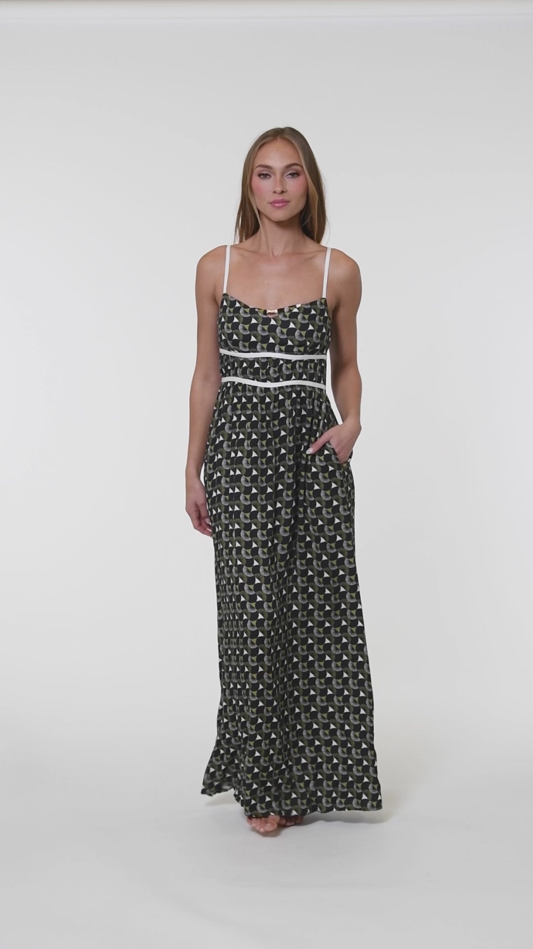 The print on this dress features a geometric pattern with small, abstract shapes in black, white, and olive, creating a visually dynamic and modern aesthetic. With easy, breezy, throw-on-and-go style, it's a warm-weather essential: perfect as a swimsuit cover-up or worn on its own.