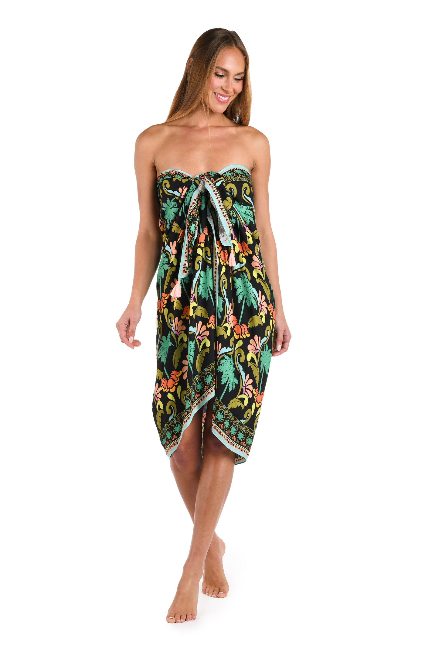 This print features a bold and tropical-inspired floral pattern with vibrant orange, green, and coral hues set against a rich black background. This sarong-style pareo wrap ties at the side offering a chic silhouette, looking equally beautiful wrapped around your hips over a one-piece suit as it does bikini bottoms.