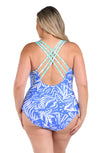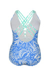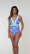 This print features a two-toned color scheme of bold white botanical motifs on a background of contrasting shades of chambray blue and seafoam green, evoking the essence of tropical leaves and seaside flora. The bodice has a daring plunging neckline that stops just short of your belly button. That same deep design is carried to the back with multi-strap cross-back design.