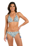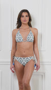 This print features an intricate, symmetrical pattern with a combination of floral and geometric motifs in shades of chambray and green on a white background. This top features a wispy cut and deep v-neckline that is playful, while the double adjustable halter straps tailor to your coverage needs. Self-tie closures at the neck and back allow for full customization.
