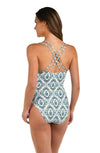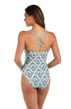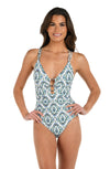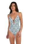 This print features an intricate, symmetrical pattern with a combination of floral and geometric motifs in shades of blue and green on a white background. Just a sexy as a bikini, this one-piece suit flaunts your figure at every curve. A lace-up detail with silver beads at the center of the bust allow glimpses of skin to peek through, while allover shirring slims and smooths for a trim look.