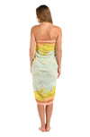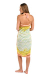 This print features an intricate, ornate design with a mix of pastel hues, including soft yellows, pinks, blues, and greens, creating a dreamy, ethereal effect. This pareo wrap ties at the side offering a chic silhouette, looking equally beautiful wrapped around your hips over a one-piece suit as it does with a bikini.