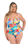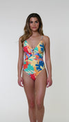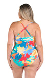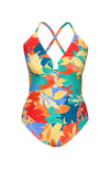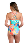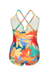 Regular price $39.00This vibrant and expressive print features a mix of organic shapes in a rich palette of orange, pink, blue, and aqua, resembling an abstract interpretation of a tropical garden. A lace-up detail with raffia rings at the center of the bust allow glimpses of skin to peek through, while allover shirring slims and smooths for a trim look. The double, adjustable straps crisscross in back.