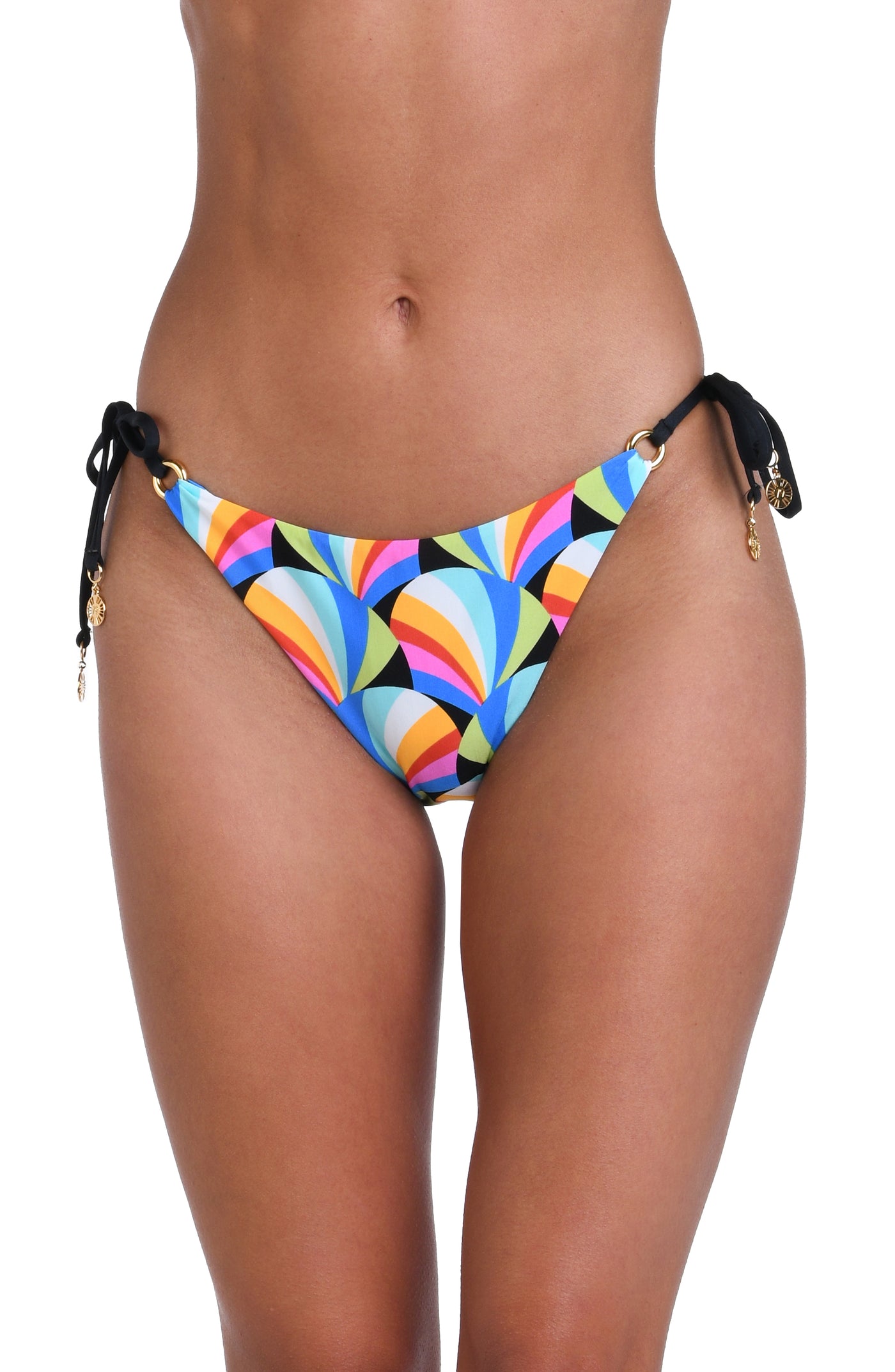 Sale price $37.00This bright print features a geometric pattern of colorful, interlocking crescent shapes creating a dynamic and playful appearance. Leaving a little something to the imagination, adjustable side tie loops trimmed with gold and black enamel hardware reveal just a hint of skin. The hipster cut flatters the hips with just enough coverage in back to keep the suit firmly in place.