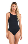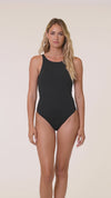 Elevate your swimwear game with this sleek black one-piece, featuring a high neckline for a modern, minimalist silhouette. But don’t be fooled by its modest front—turn around to reveal a striking wrap-style back, blending elegance with just the right touch of allure. The perfect balance of sophistication and edge, designed to make a statement from every angle.