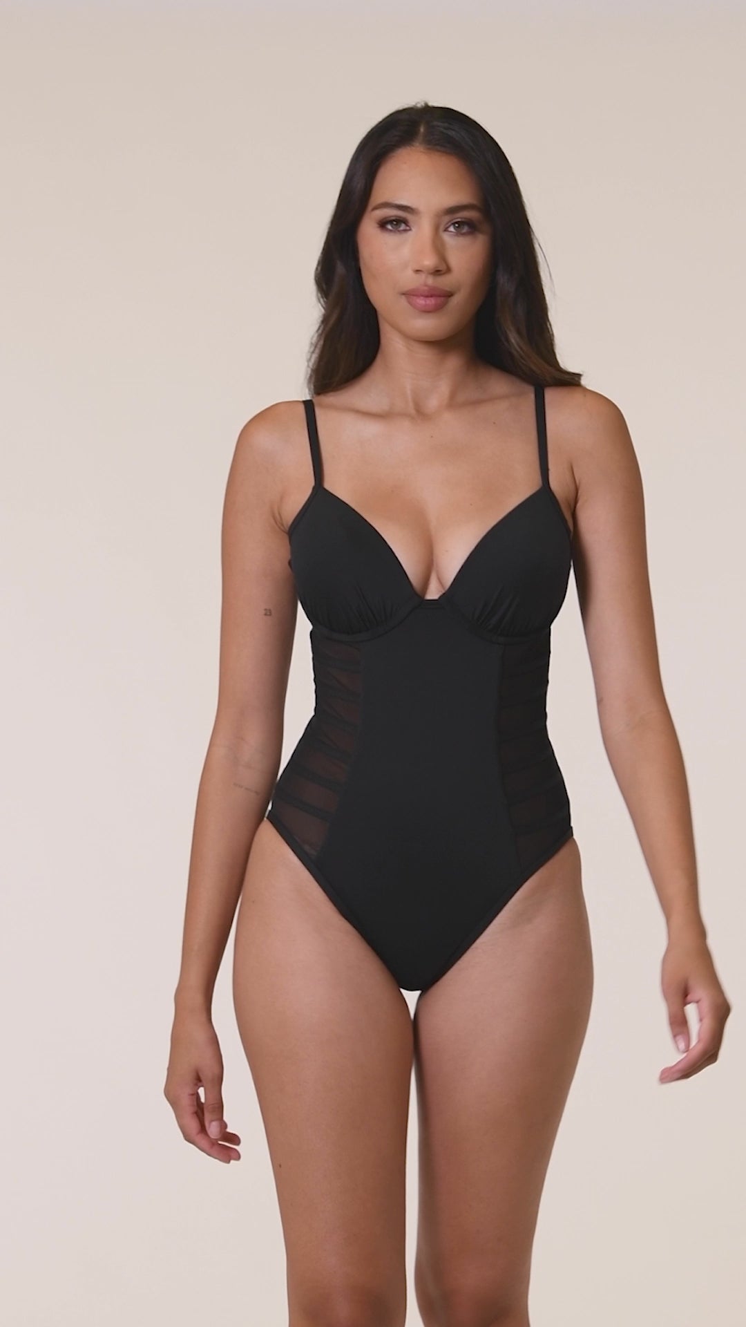 This striking one piece features a sleek black design with sheer panels on the sides, creating a slimming and visually striking effect. The front offers a structured, underwire bust for support, while the back showcases a chic cut-out detail with adjustable straps, blending modern style with functional elegance.