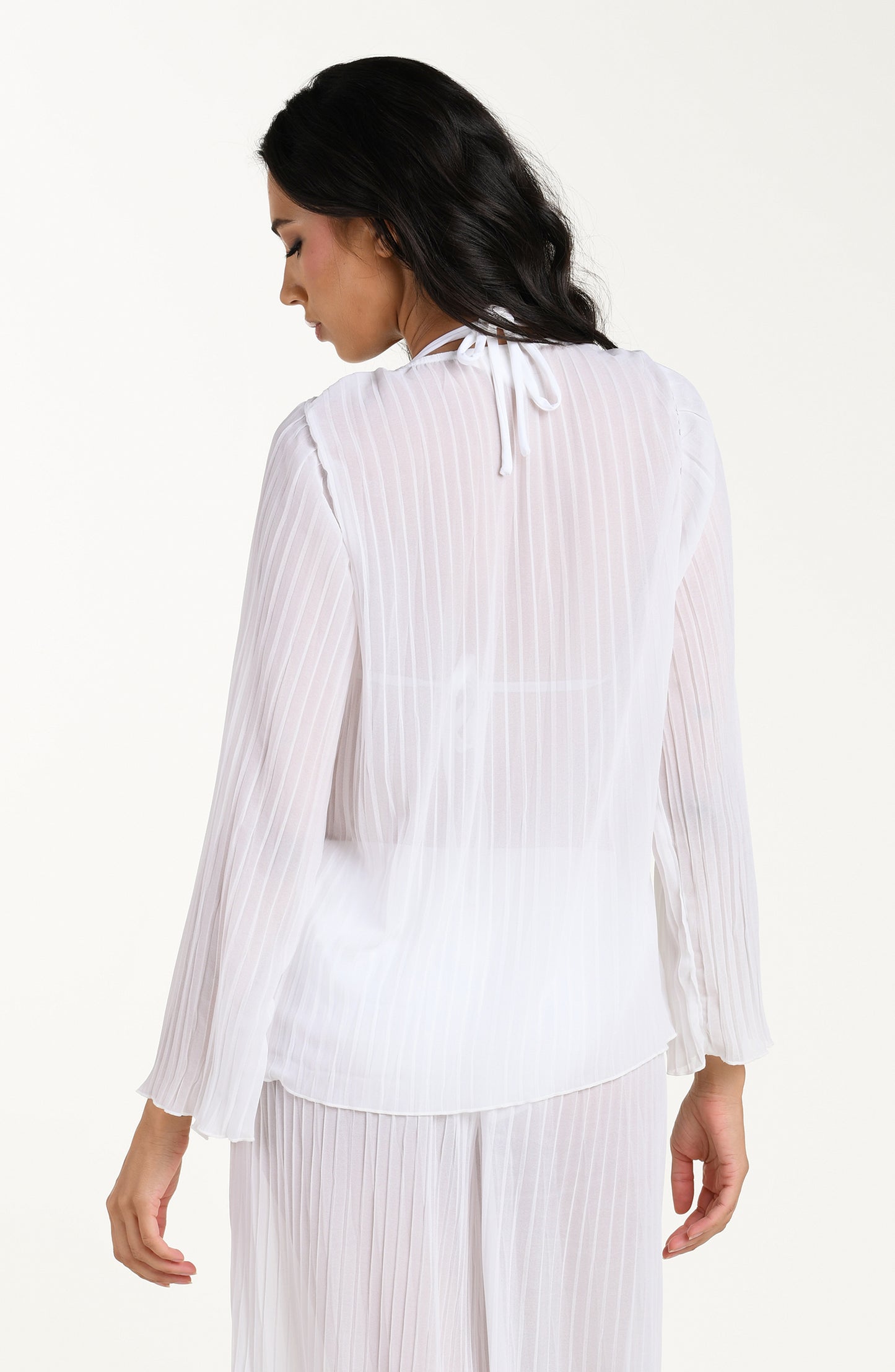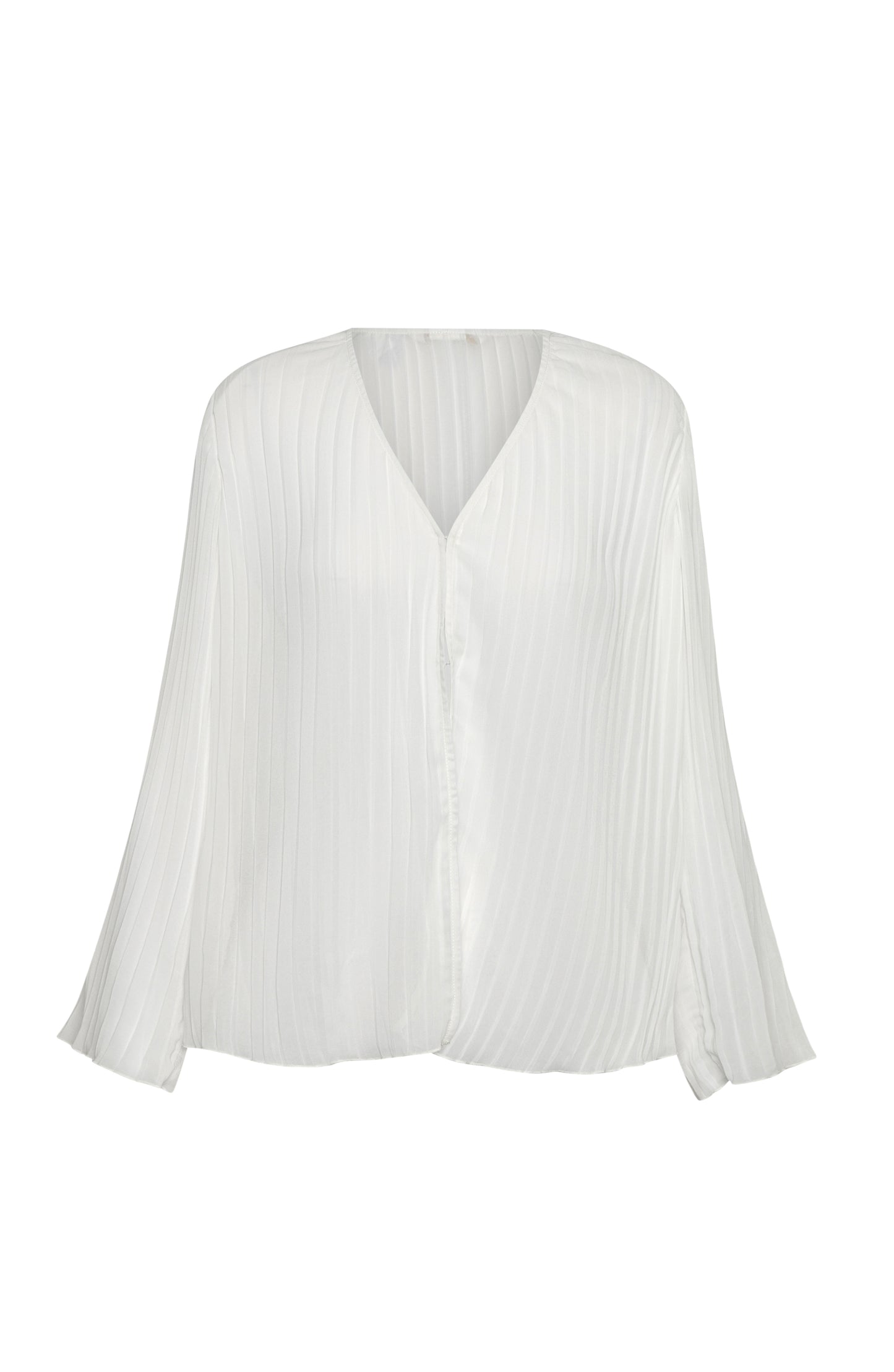 This Long Sleeve Pleated Top from our Sunbeams Collection features a loose, flowy fit with a deep V-neckline, long flared sleeves, and an allover vertical pleated design ending in a softly scalloped hem for an elegant, breezy look.