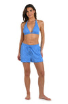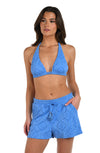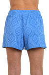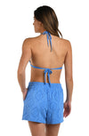 This jacquard fabric features a delicate, lace-inspired pattern in a vibrant shade of chambray, with intricate geometric and floral motifs subtly woven into the fabric. This swimsuit cover-up provides a relaxed and breezy fit, allowing for effortless movement and all-day comfort. The lightweight, breathable fabric drapes beautifully over the body, making it an easy-to-wear layer for the beach or poolside.