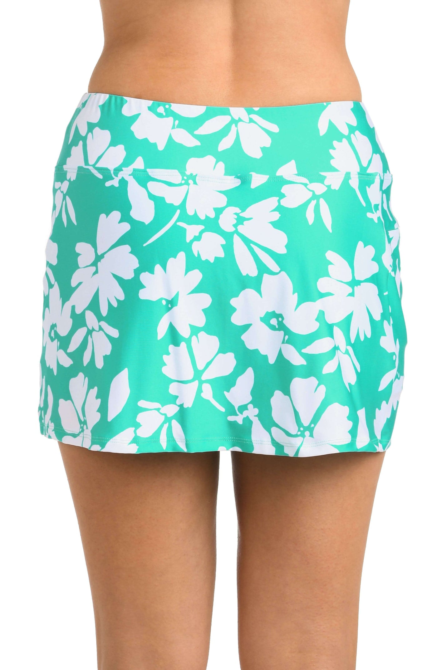 Get ready for a bold look with white floral silhouettes set against a vibrant colored background, creating a striking contrast that's sure to turn heads! This skort is perfect for fun on the sand or for a ride on the waves, this feminine and sporty swim skort covers all of your needs. Full bottom coverage and tummy control keeps you feeling confident.
