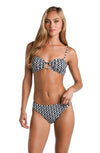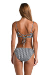 This hipster bottom showcases a geometric black and white print, featuring a repetitive, interlocking pattern that gives a sense of intricate tessellation. The high-contrast design creates a striking optical effect, which is both modern and timeless. Resting at the hips for figure-flattering style, they offer just enough coverage in back to ensure things don't get too cheeky.