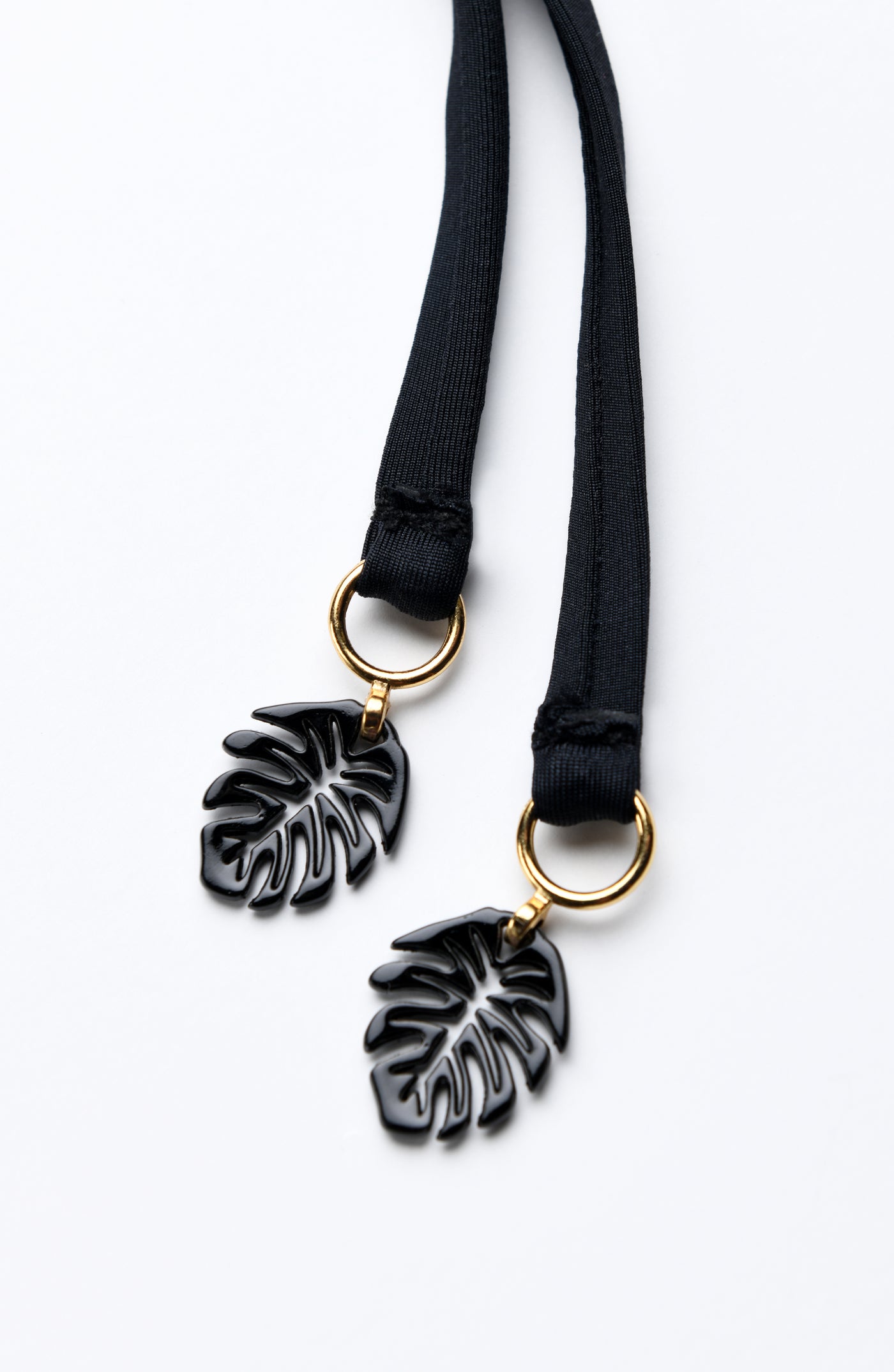 Regular price $67.50Featuring bold, oversized tropical leaf patterns in a striking black, green, and cream palette, this beautifully engineered print offers a visually impactful and stylish look, perfect for making a statement. The classic triangle silhouette is elevated with a plunging V-neck and a soft band, giving it a touch of sophisticated flair. The halter-style straps loop around the neck and tie in back with a triangular shape for a unique finishing touch.