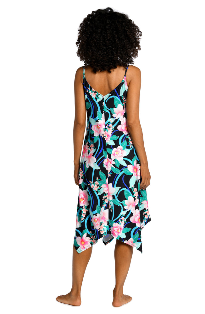 Regular price $29.00Destination paradise. The beautiful blooms set against a black background on this cover-up bring to mind a moonlit stroll along a sandy beach. Lingerie straps and a V-neck facilitate easy ons and offs for throw-on-and-go ease. Flattering on most body types, the asymmetrical handkerchief hem gives this dress an easy, breezy vibe.