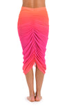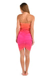 This skirt features a vibrant ombre effect, transitioning from a warm coral-orange at the waist to a bold pink hue towards the hem. The shirred mesh overlay adds texture and dimension, enhancing the gradient design with a stylishly draped silhouette.