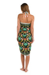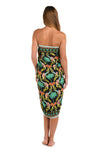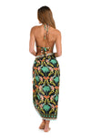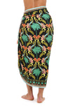 This print features a bold and tropical-inspired floral pattern with vibrant orange, green, and coral hues set against a rich black background. This sarong-style pareo wrap ties at the side offering a chic silhouette, looking equally beautiful wrapped around your hips over a one-piece suit as it does bikini bottoms.