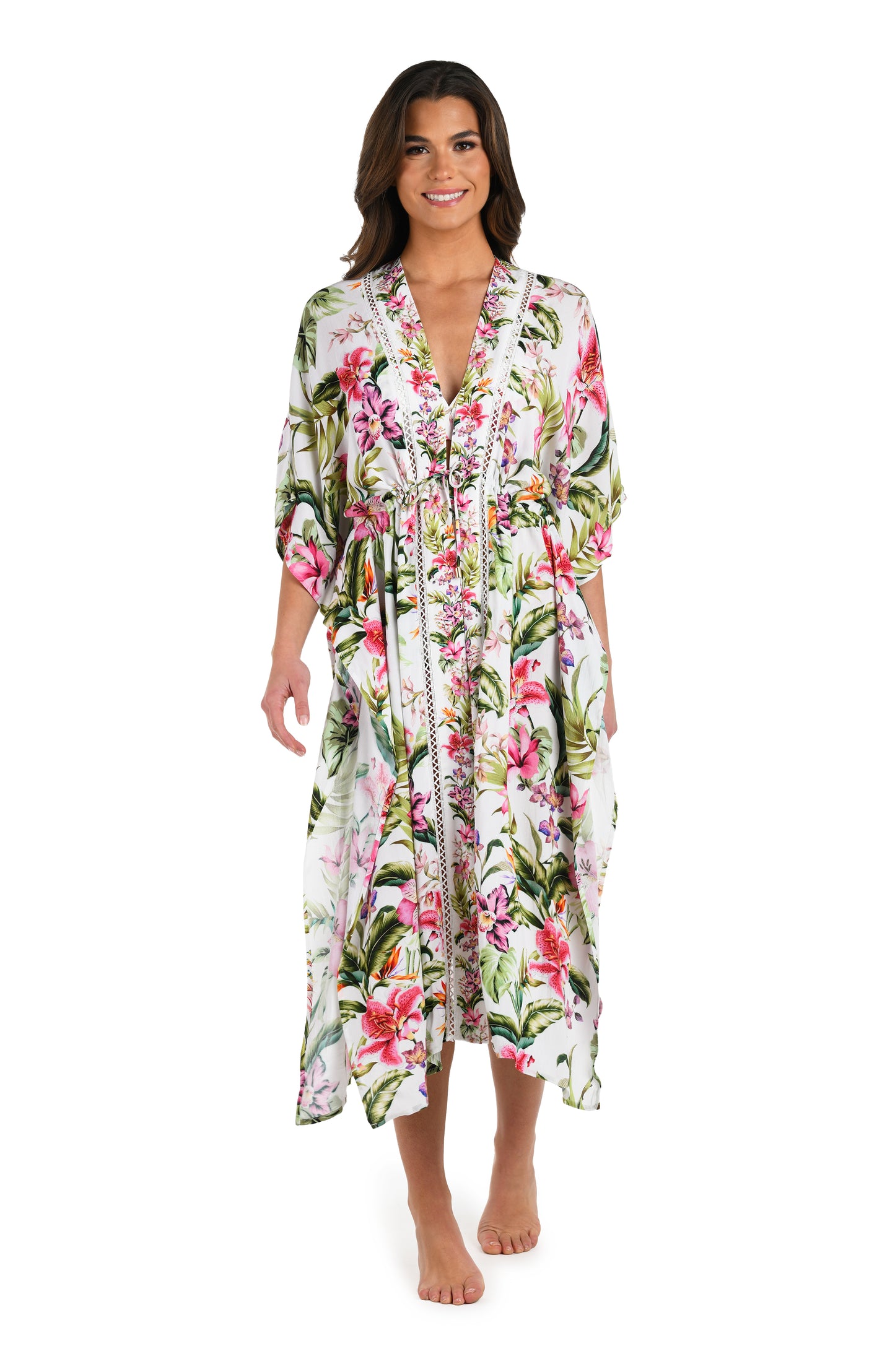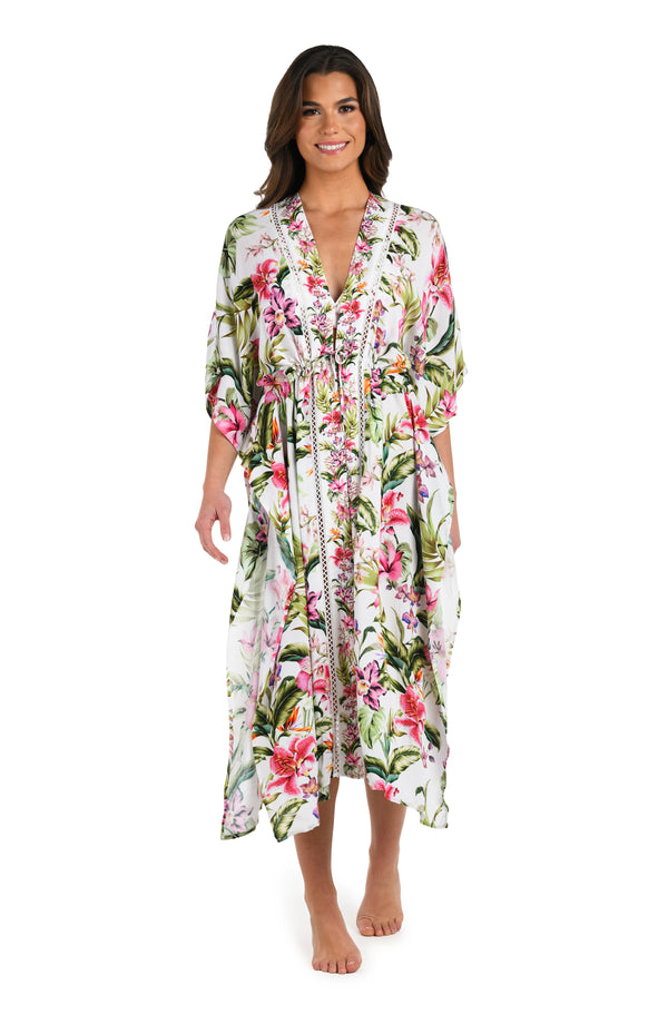 This lively floral design features a vibrant tropical print with lush green foliage and blooming pink, orange, and violet flowers set against a crisp white background. The coolest cover-up around, it can be worn two ways: open and long or tied in front. Throw it on after a day at the beach or post dip for effortless coverage.