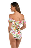 This print features a vibrant tropical print with lush green foliage and blooming pink, orange, and purple flowers set against a crisp white background. This off-the-shoulder one-piece swimsuit provides a flattering and secure fit, with a ruffled neckline that adds a stylish and feminine touch.