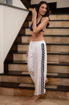 These wide leg pants feature a clean and minimalistic design, accented with playful navy scalloped wave trim along the hem for a touch of nautical charm. Pull on over your favorite swimsuit for a chic cover-up or pair with a camisole for an elevated look that's completely effortless.