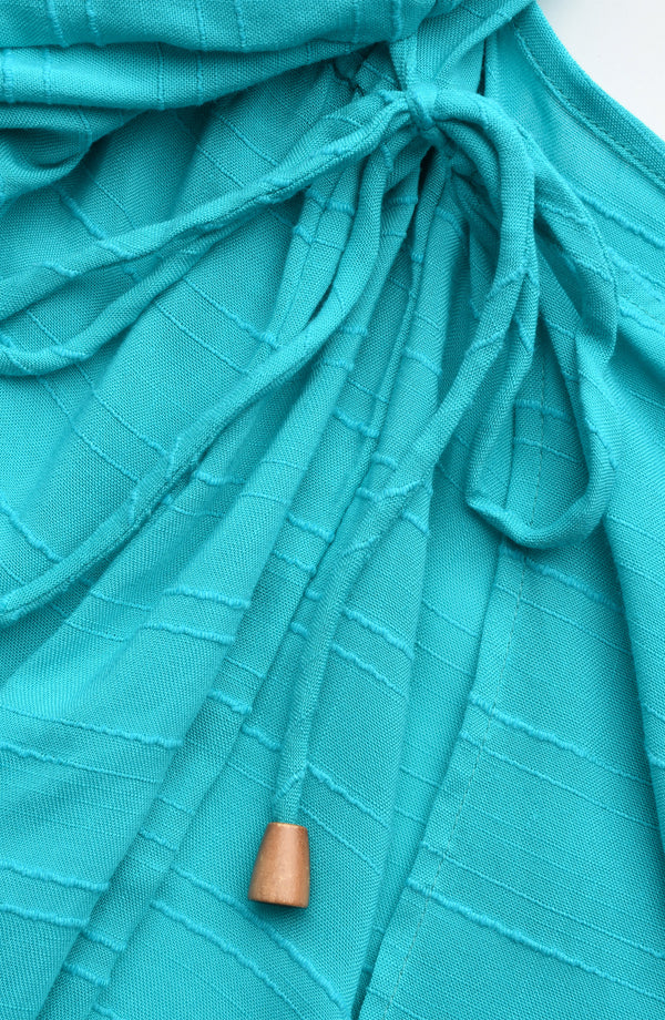 A vibrant teal dress that brings effortless charm! Made from lightweight, textured fabric, it boasts a button-down front and an adjustable drawstring waist for a flattering silhouette. Its relaxed fit and three-quarter sleeves make it a versatile, breezy choice for casual outings or beachside adventures.