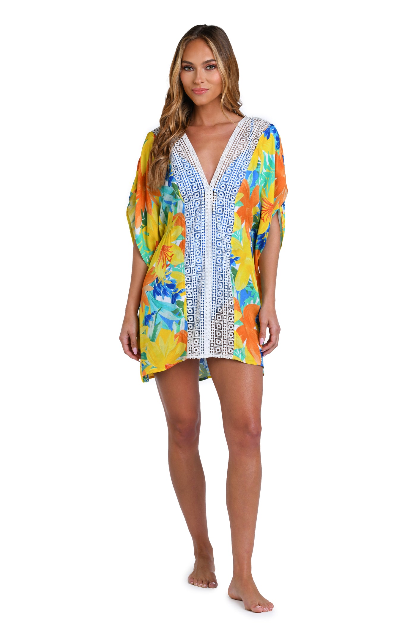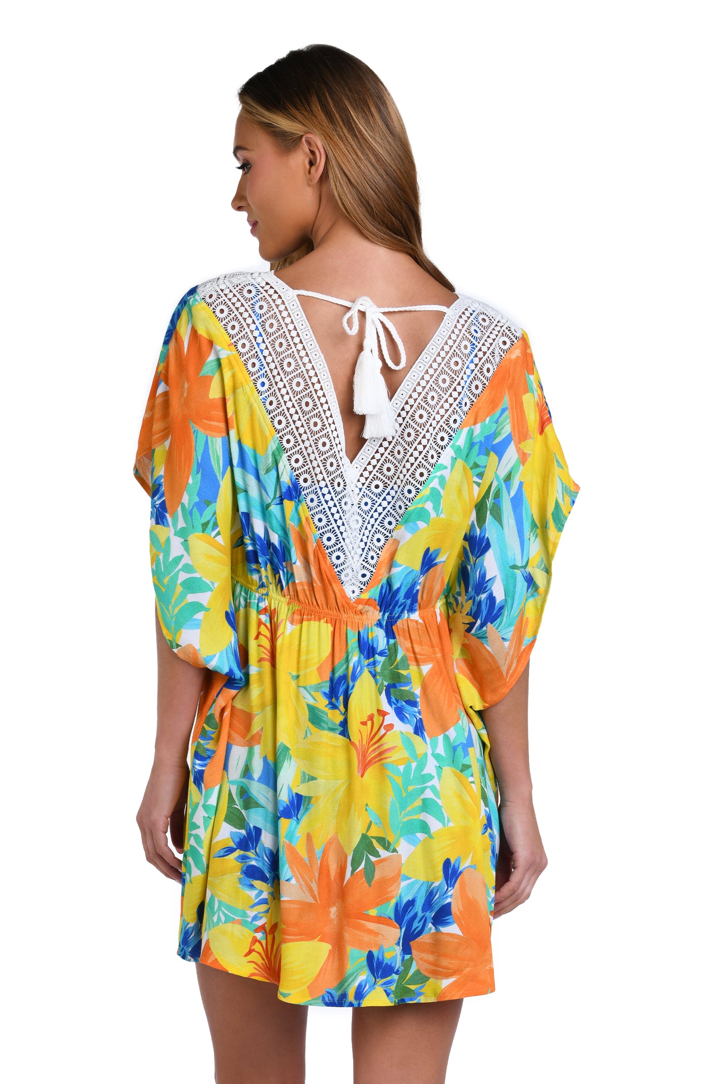 Regular price $65.00This bright and cheerful floral print has a summery vibe, perfect for a beach day. Styled with breezy dolman sleeves and a flowy fit, this cover-up is finished with crochet trim, braided ties, and thread tassels for a playful touch.