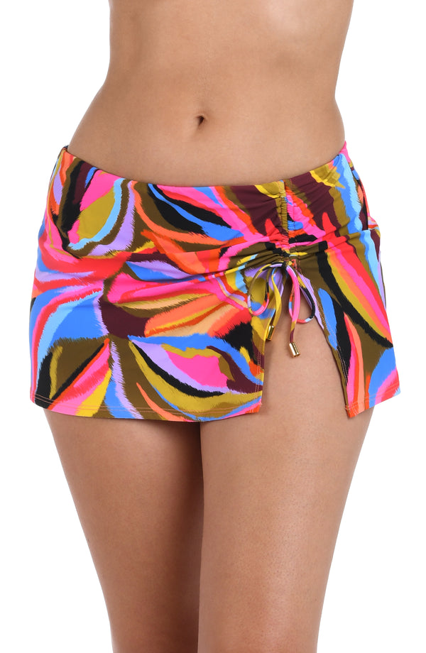 The bold, abstract design features swirling, organic shapes in a vivid palette of pinks, blues, greens, and oranges, creating a dynamic wave-like effect. A sweetheart neckline with a wrap-style front accentuates the bustline while still providing just-right coverage. Adjustable over-the-shoulder straps and molded cups give you the perfect amount of lift.