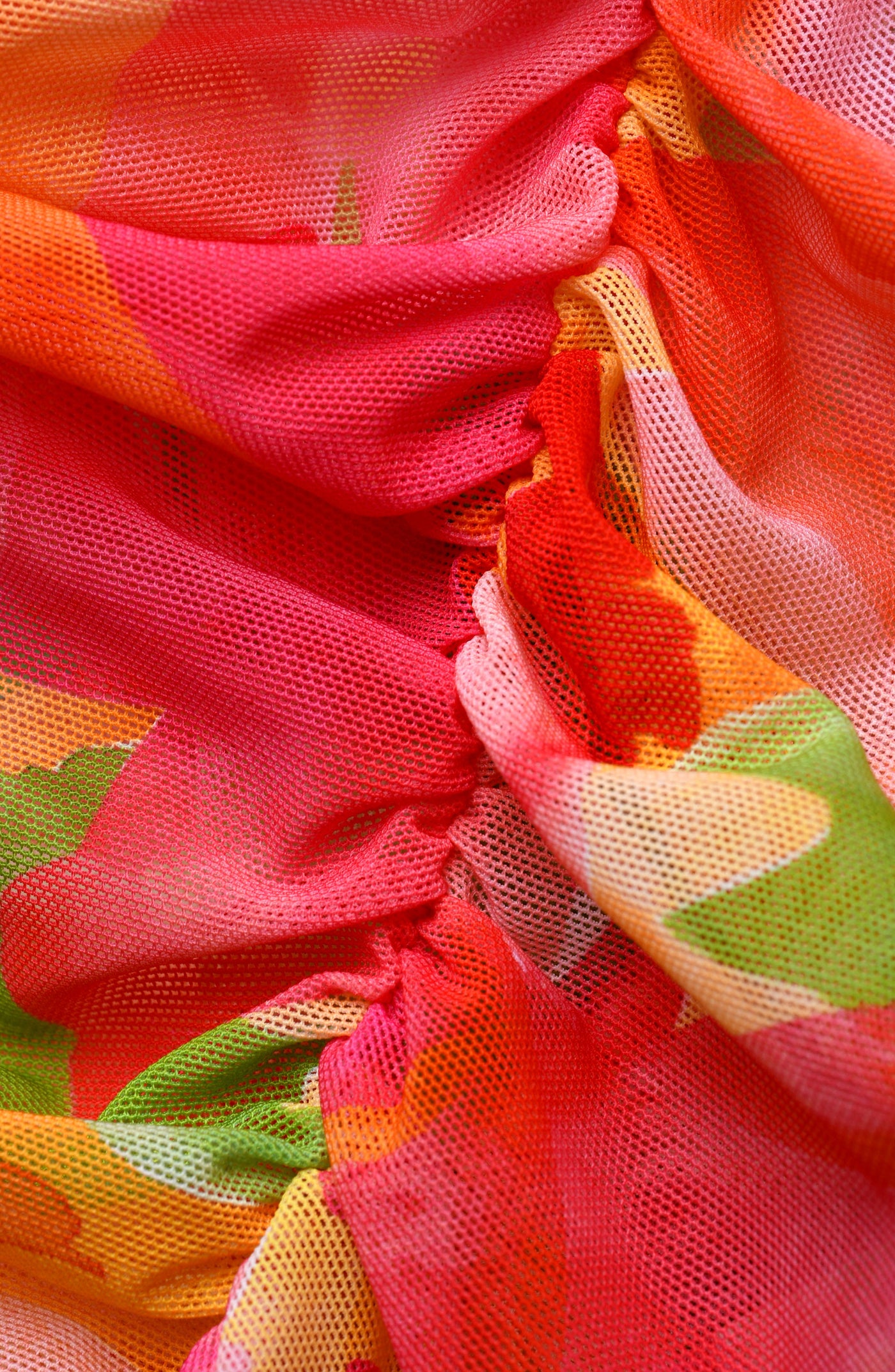 This print features an intricate, ornate design with a mix of pastel hues, including soft yellows, pinks, blues, and greens, creating a dreamy, ethereal effect. This mesh cover-up skirt features a shirred design with a fitted silhouette, offering a flattering and elegant look. The lightweight, sheer fabric ensures breathability and comfort, making it perfect for layering over swimwear.